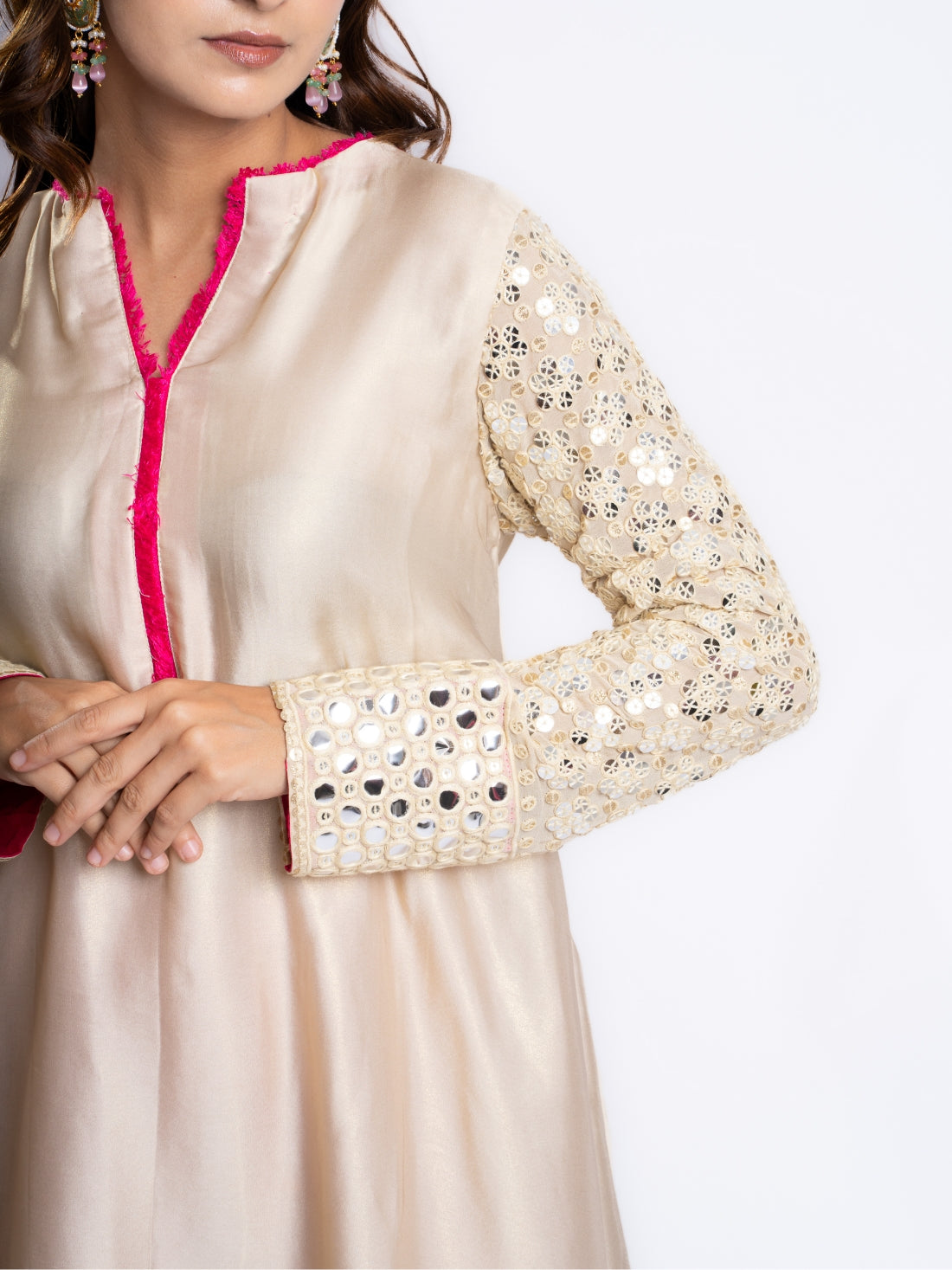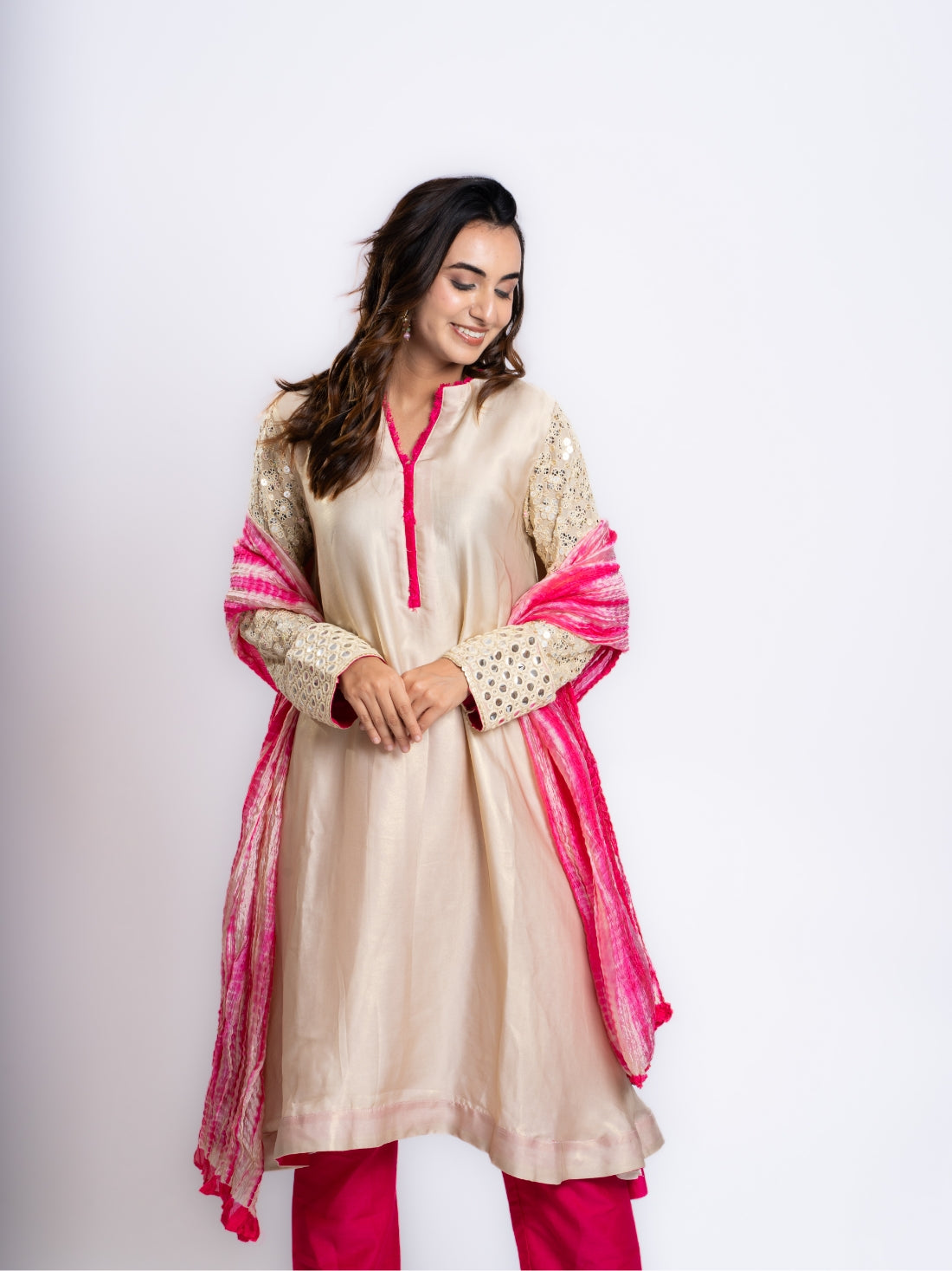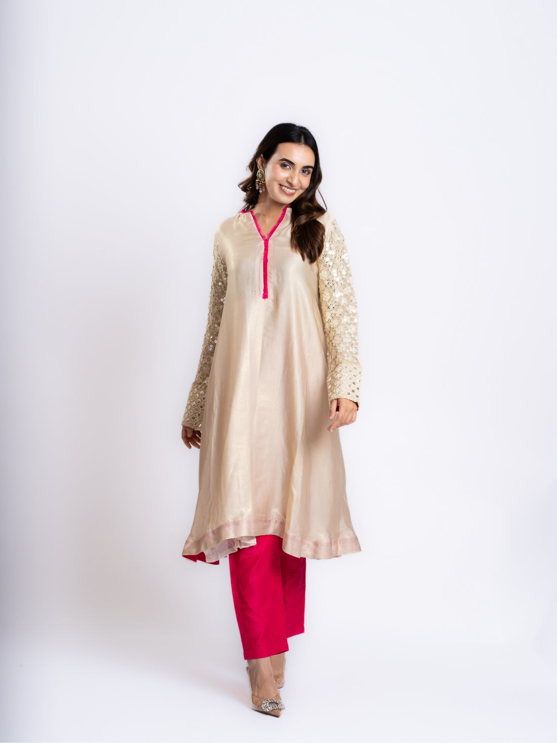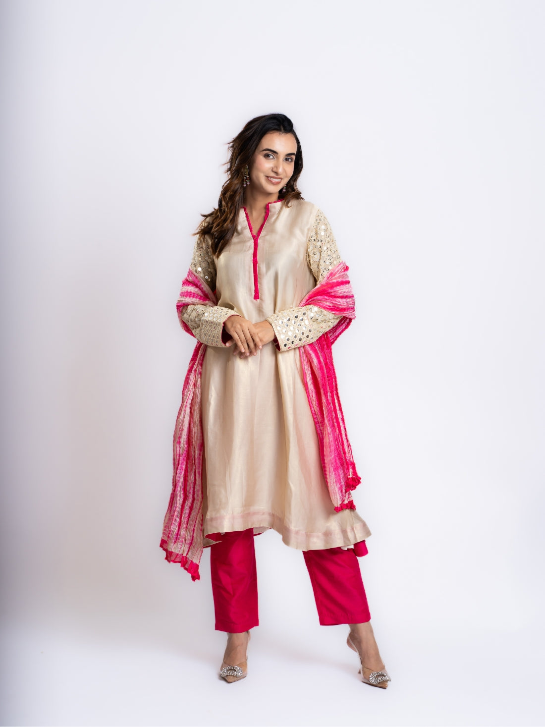 DETAIL: TISSUE KURTA + PANT, CRUMPLED DUPATTA, WORK ON SLEEVES